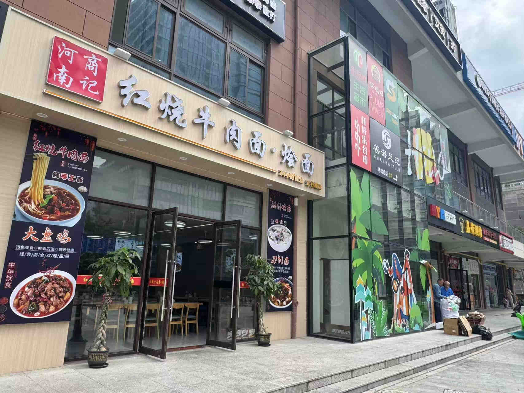 我的店铺对面是万达广场,旁边是几栋写字楼,几千员工,楼上是个商务楼,一些培训类型的都在楼上,后面是小区,旁边门口直通小区出入口,因为家里有事情才转的,带天然气,带冷库,空调,装修都带